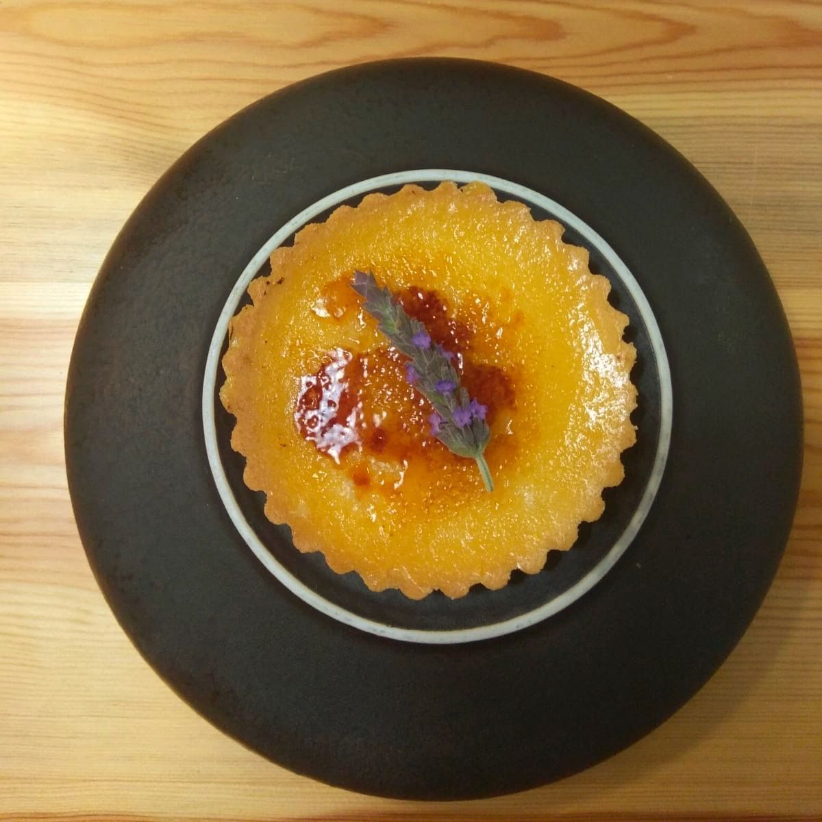 -Mousse de limón sobre tarta de almendras, helado de mascarpone y falsa canela